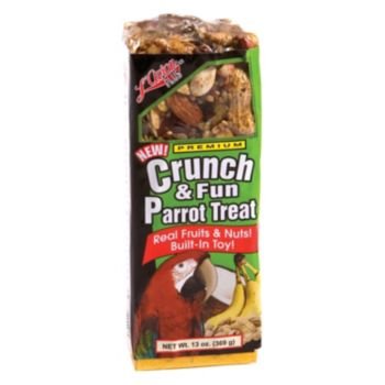 L'Avian Plus Premium Crunch and Fun Parrot Bird Treat Give your hookbill a safe and healthy...toy! Loaded with human-grade fruits and nuts and filled with a hidden surpise, this Crunch and Fun Bird Treat will keep your pet happy and entertained. Features: Mixed tocopherols (vitamin E) and citric acid (the natural acid from citrus fruits) are used in place of chemical preservatives Natural, delicious treat your bird will crave Hang from cage or perch with the included hanging, metal chain and clip Prevent cage boredom Item Specifications: Size: 13 oz. Ingredients: Pistachios, Peanuts, Dried Raisins, Corn, Dried Pineapple, Dried Bananas, Whole Peanuts, Dried Papaya, Dundicut Peppers, Sunflower Kernels, Dried Carrots, Dried Coconut, Whole Pumpkin Seed, Sunflower Seed, Almonds, Walnuts, Whole Pistachios, Dried Green Peas, Dried Apples, Whole Pine Nuts, Gelatin, and Corn Syrup Guaranteed Analysis: Crude Protein (Min).....12.0% Crude Fat (Min)..........18.0% Crude Fiber (Max).......12.0% Moisture (Max)...........12.0%